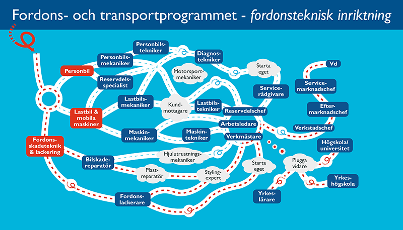 För att välja rätt väg framåt på dessa karriärvägar behöver du gå en bra grundutbildning inom någon av de sex yrkesgrenarna: personbilsteknik, bilskadeteknik, fordonslackering, lastbilsteknik, maskinteknik eller reservdelsspecialitet. Väl ute i arbetslivet får du visa att du kan det du lärt dig och är öppen för vidareutbildningar.